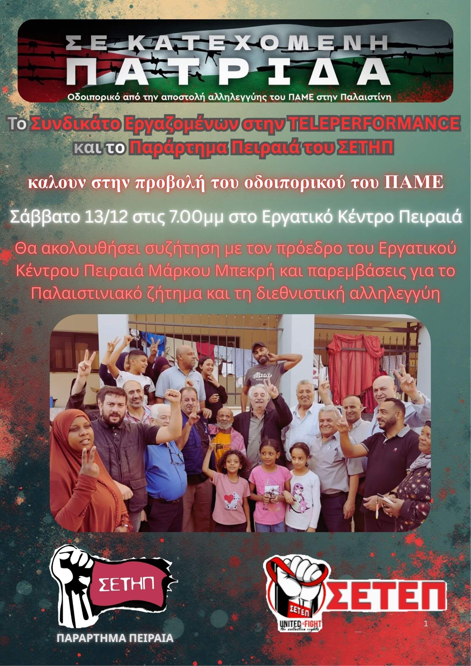 Το Σωματείο Εργαζομένων στην Teleperformance και το Παράρτημα Πειραιά του ΣΕΤΗΠ προσκαλούν στην προβολή του οδοιπορικού του ΠΑΜΕ στην Παλαιστίνη “Σε Κατεχόμενη Πατρίδα”. Σάββατο 13/12 στις 19.00 στο Εργατικό Κέντρο Πειραιά.